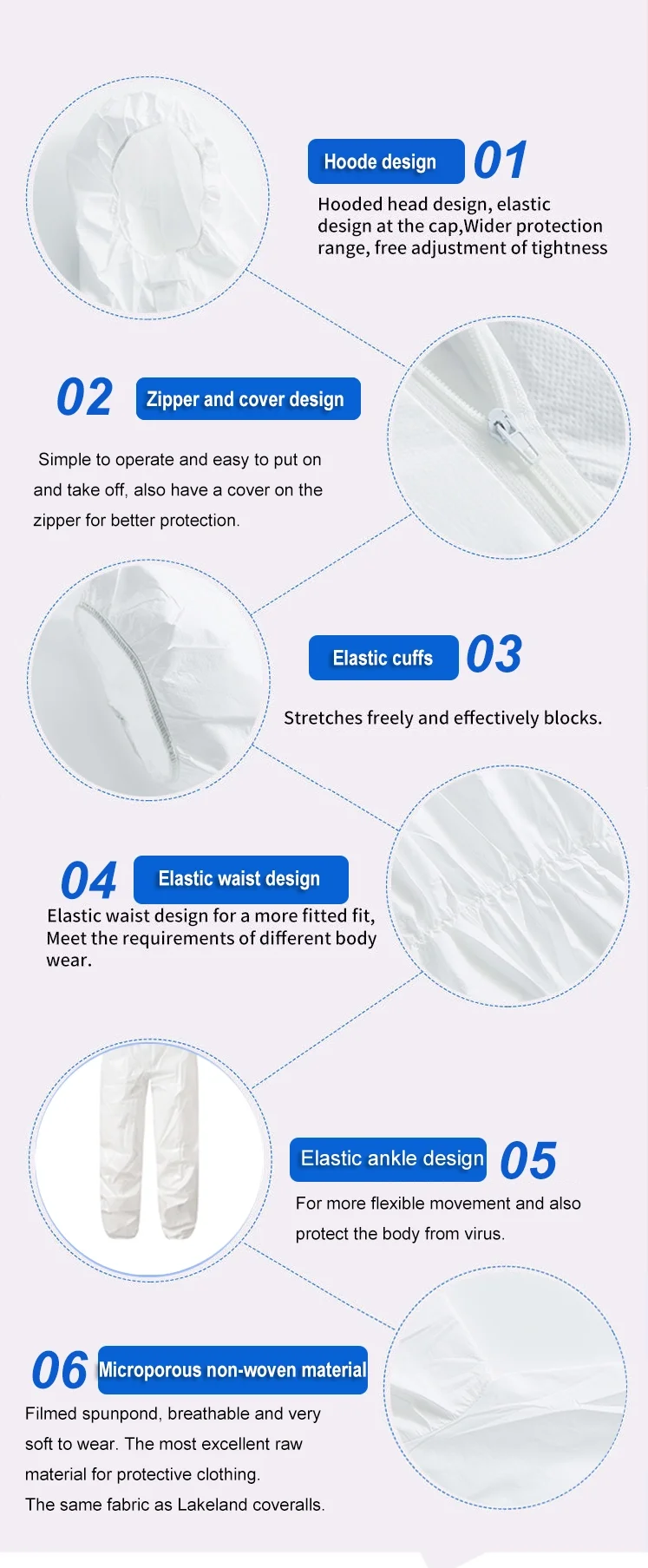 Style | 1.With collar/hood 2.Bat-wing sleeve/flap 3.Zipper front 4.Elastic at wrist and ankle /without elastic at wrist and ankle 5.Waist with elastic or without elastic 6.With shoe cover or without shoe cover |