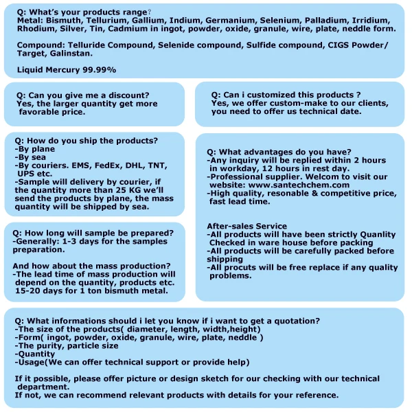 1. Santech Materials specializes in producing high-purity Bismuth metal with purities of 5N, 6N and 7N. The size of 4N is