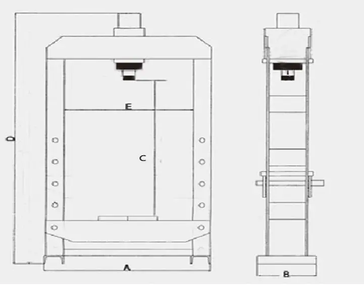 Model | A Mm | B mm | C mm | D mm | E mm | stroke mm | ton T | voltage V |