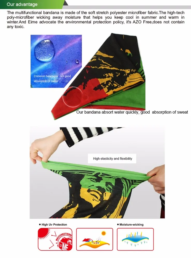 Advantage: | Breathable, sweat and moisture absorption, wind resistant You Can use them in 12 different wear way. Funny and fashion. | ||||