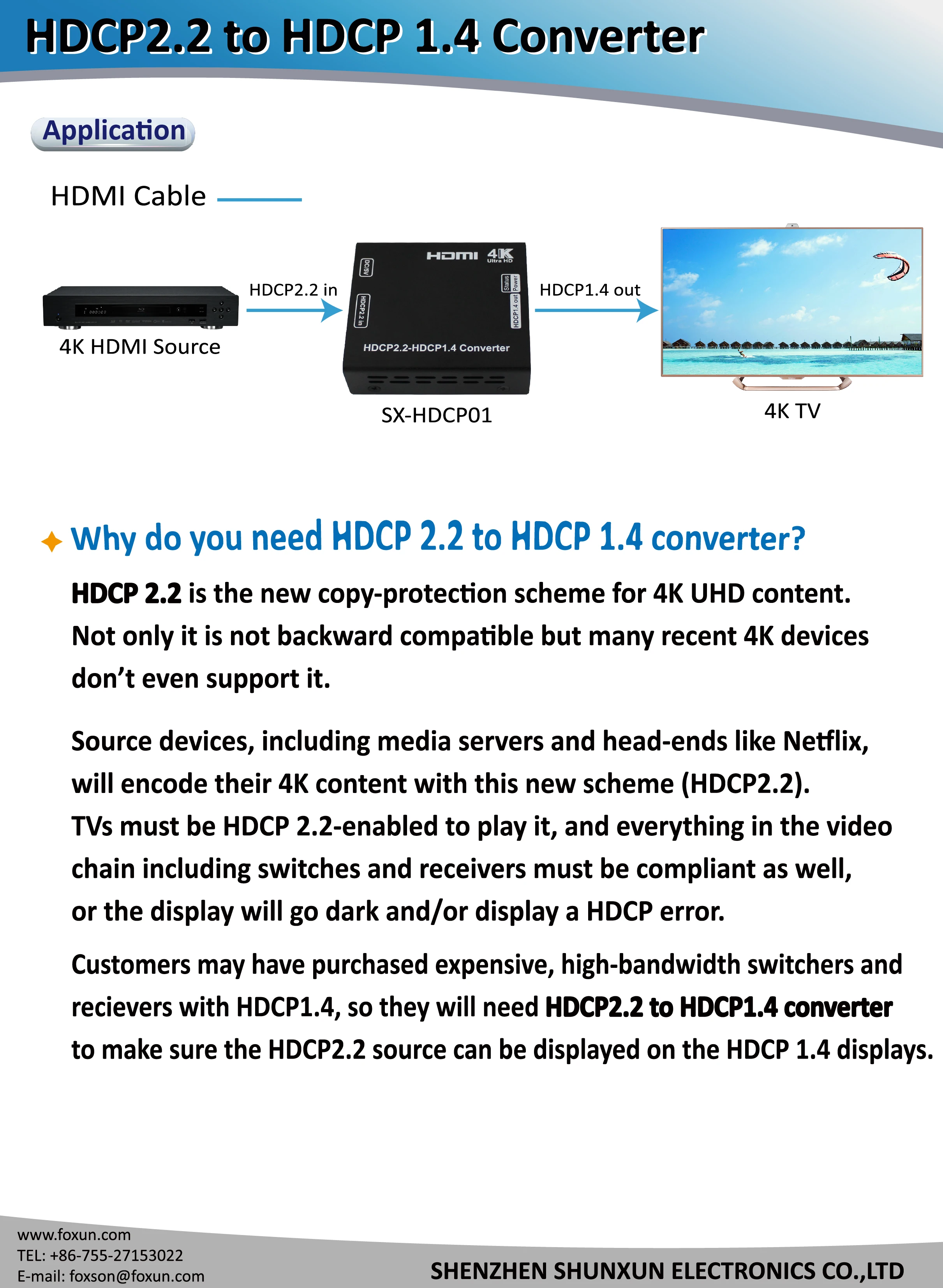 Shenzhen Shunxun Electronics Co.,Ltd was established in 2003. We cover more than 5000 square meters and over 100 workers working on streamline production lines. We're a licensed specialized manufacturer of HDMI and HDBaseT full series products, including HDMI/HDBaseT Splitters, Extenders, Matrices ,Switchers ,Converters etc under the brand "FOXUN".