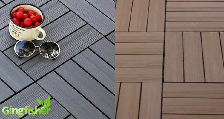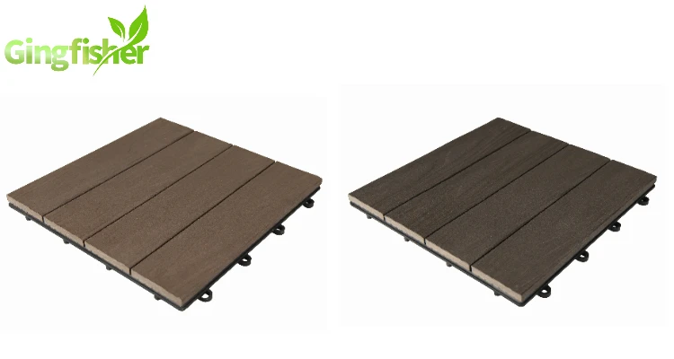 Gingfisher Composite Deck Tile in a sturdy wood and plastic composite, which makes them durable enough to resist fading and damage from rain, sun, and other weather conditions as well as damage from insects. This tiles snap together in minutes without tools, making them perfect for covering unsightly concrete on balconies, patios and other outdoor spaces.
