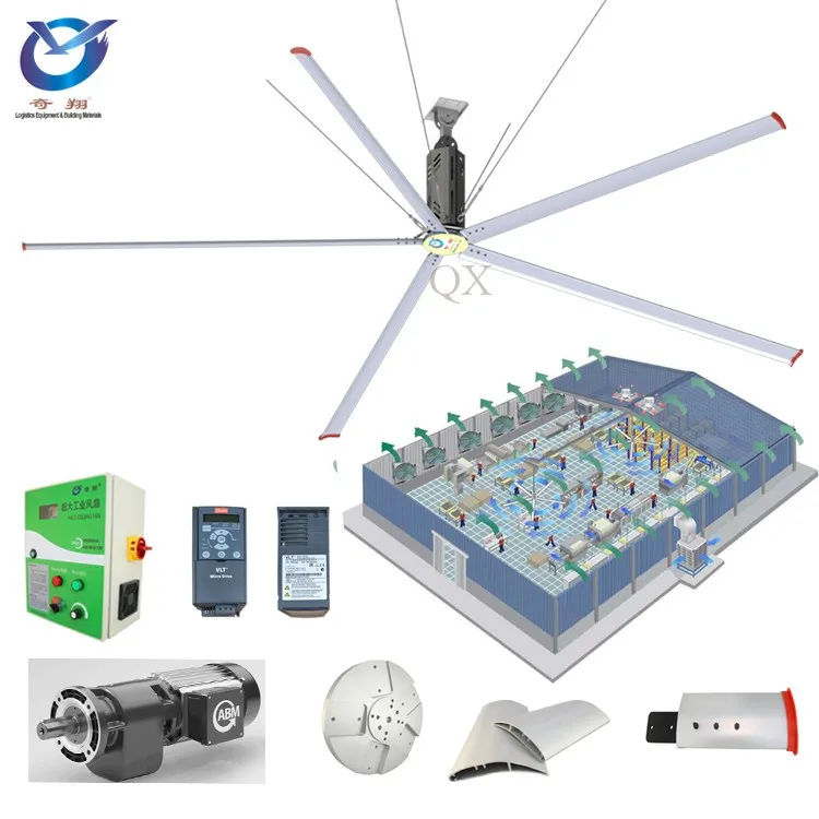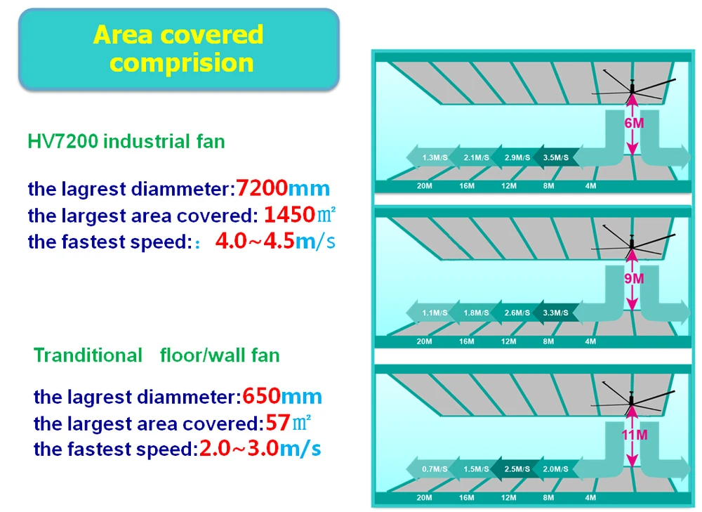 The fan is typically of 5(in odd number) pcs of large diameter blades up to 7.2m each with the effective coverage of 1500SQM. It consumes only 1.5KW electricity per hour, which can replace hundreds large diameter Industrial Ceiling Fan with 5 blades pedestal fans or wall-mounted fans.