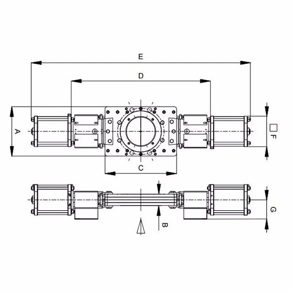 | DN | Bdbar | A | B | C | D | E | F | G | CylΦ | air conection | G.Weight kg |