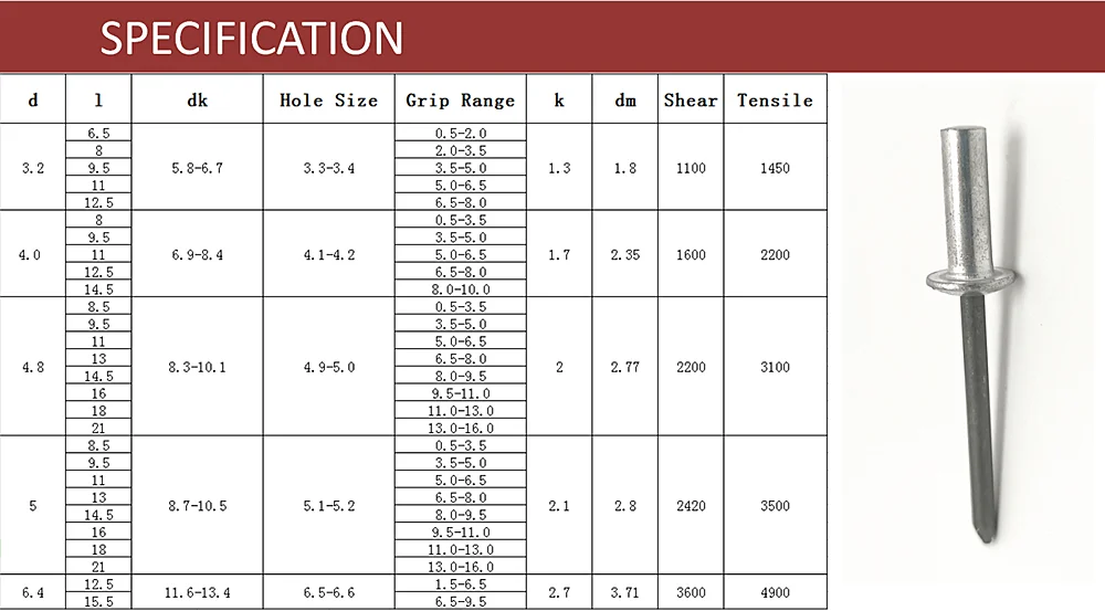 Blind Rivet Size Sheet