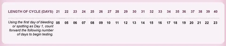 Determine the length of your normal menstrual cycle, which is from the beginning of one period to the beginning of the next. Using the first day of bleeding or spotting as day 1. Please recall the status of latest months to assure the average cycle length, then circle out the cycle length in the first line of below chart and read out the corresponding numbers(days) in the second line. The following, count the numbers in second line from the first day of your menstrual cycle, we will get a time that you can start your detection.