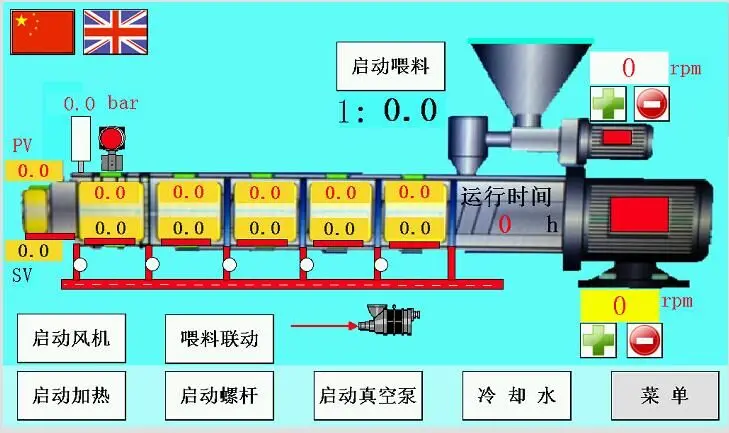 The equipment adopts SIEMENS PLC touching screen Control System. Some important data such as melt temperature, melt pressure, screw speed are displaced instantly. It is easy to be operated.
