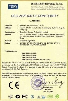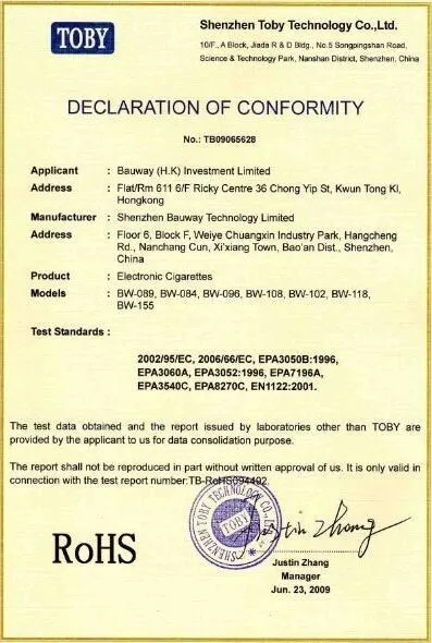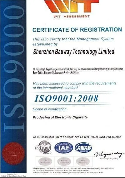 Bauway’s distinguished electronic products always enjoy wide popularity around the world, such as in America, Europe, and Asia and so on. We hold a complete quality system and carry such certificates as CE, RoHS, ISO9001.We adhere strictly to International Environmental Management System of ISO14000 and ERP Resource Management System. With "Security+Integrity+Professional+Fast+High quality+Good service+Low price" as our base principle, we are determined and confident to make a difference in electronic cigarette line and are always doing our best to make our brand take health and satisfaction to our customers.