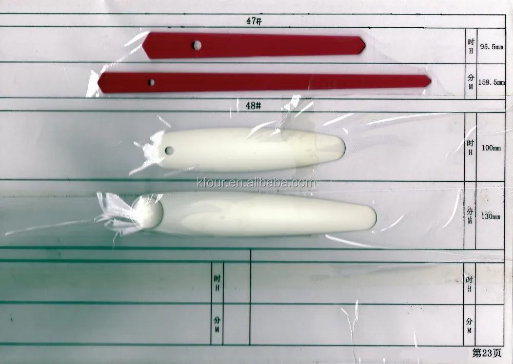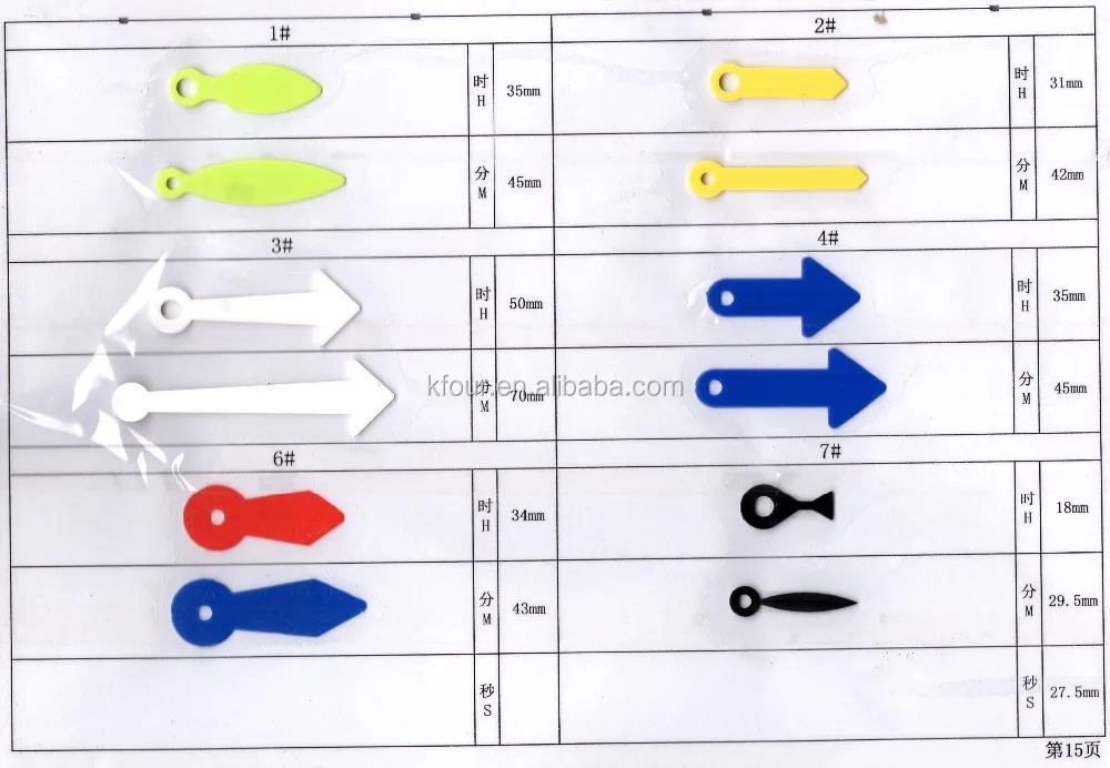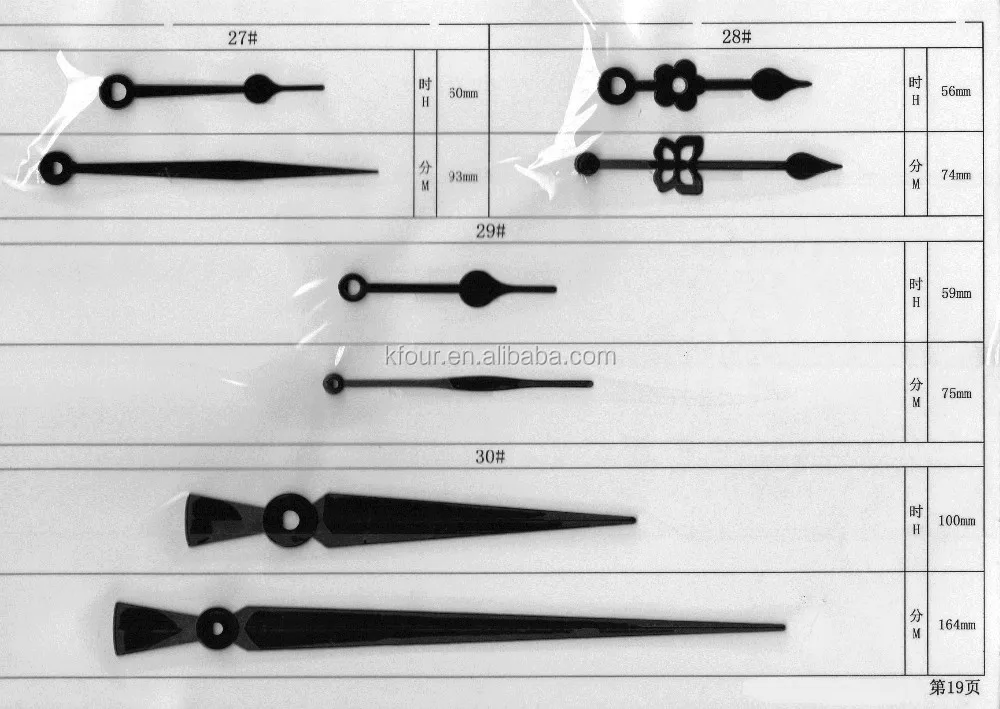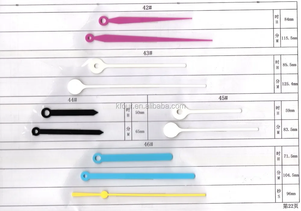These clock hands are metal or plastic. To select the correct length hands, measure from movement shaft hole to time ring on your dial.The length shown in the table below is the minute hand length; the hour hand length is proportionate. All black clock hands can be spray painted any color to match the design of your clock.