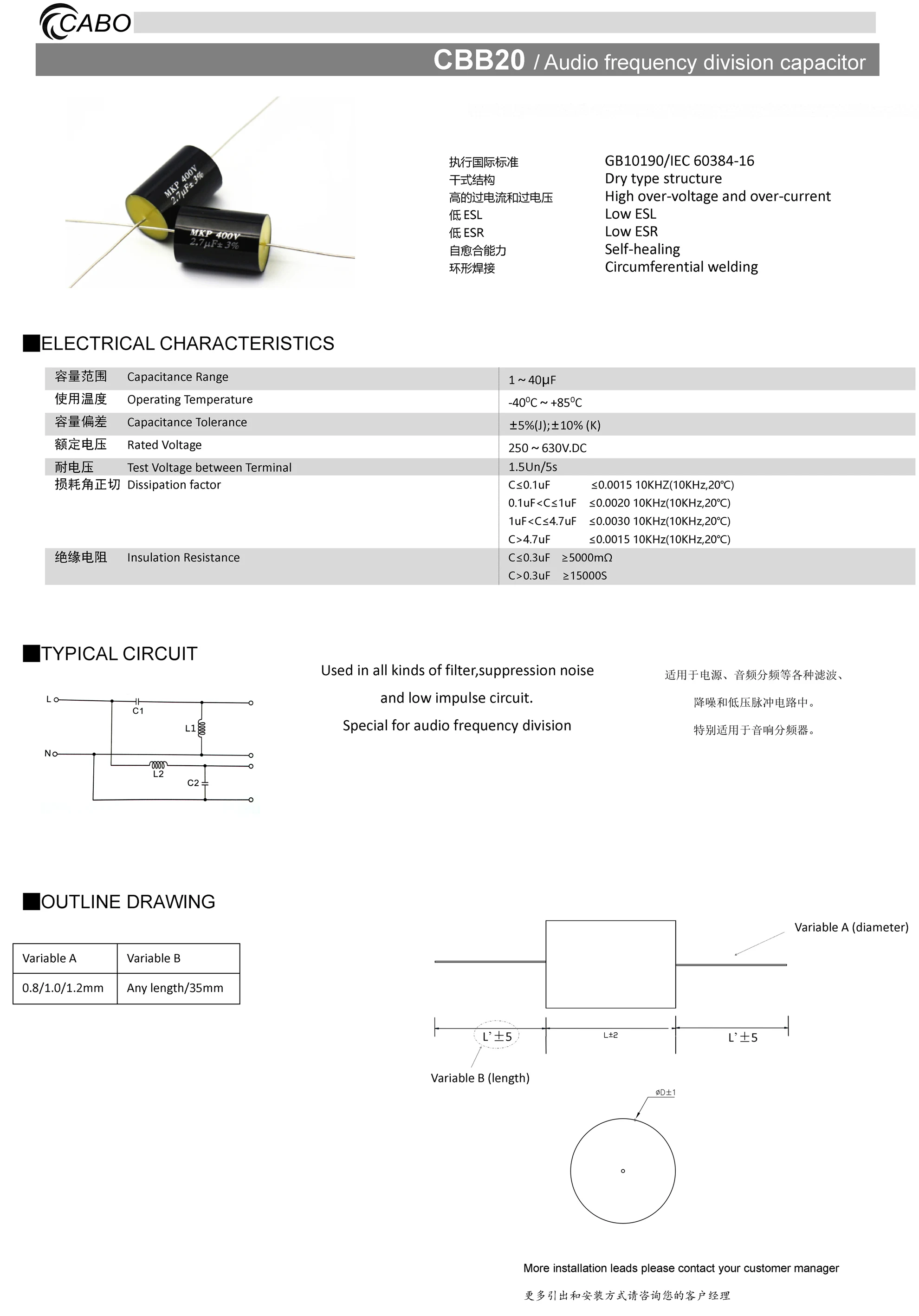 CBB20 series acoustic grade audio capacitors can be used into all kinds of filter,suppression noise and low impulse circuit.Special for audio frequency division.