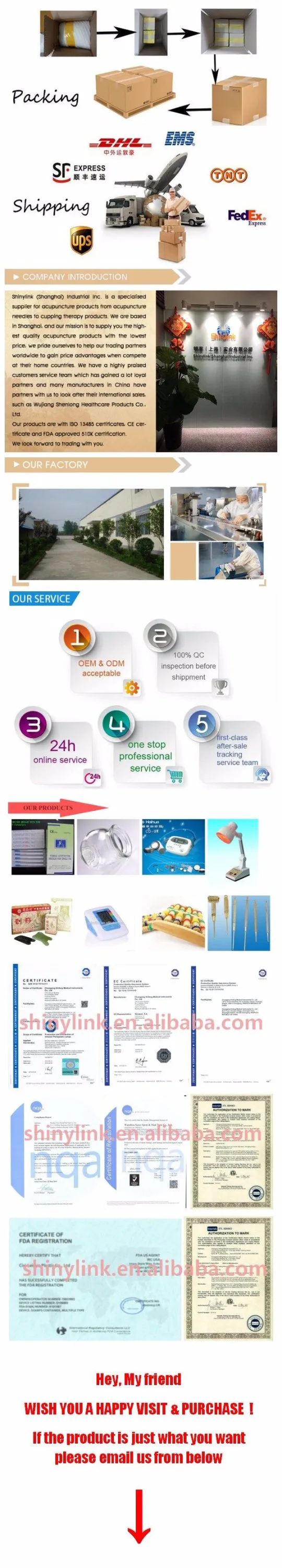 Shinylink (Shanghai) Industrial Inc. is a specialised supplier for acupuncture products from acupuncture needles to cupping therapy products. We are based in Shanghai, and our mission is to supply you the highest quality acupuncture products with the lowest price, we pride ourselves to help our trading partners worldwide to gain price advantages when compete at their home countries. We have a highly praised customers service team which has gained a lot loyal partners and many manufacturers in China have partners with us to look after their international sales, such as Wujiang Shenlong Healthcare Products Co., Ltd.