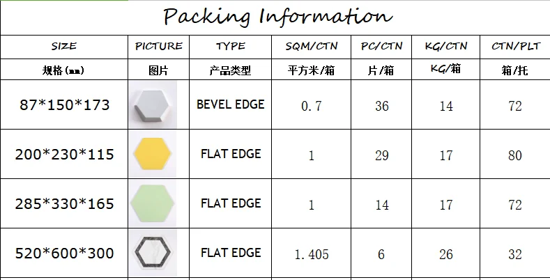 packing | 29PCS/CTN;1SQM/CTN,17KG/CTN, 80CTNS/PLT |