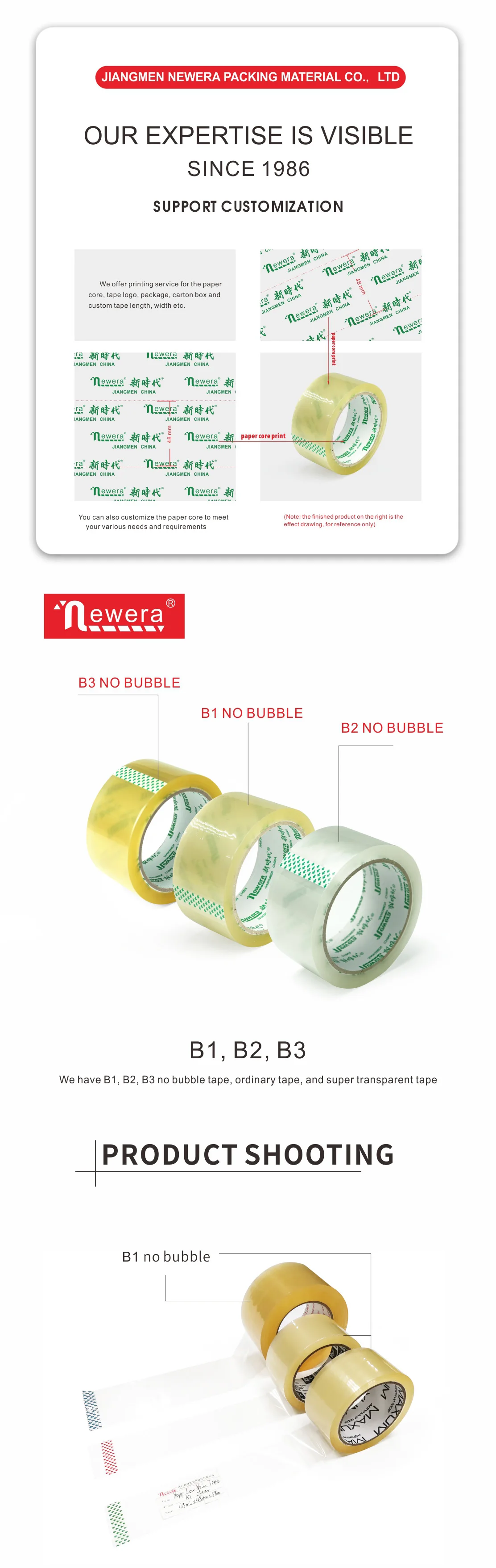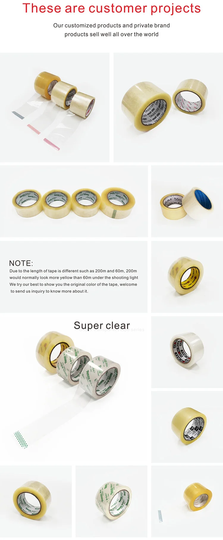 Our company product line includes super clear/low noise/no noise Bopp packaging tape, color tape/print tape, Bopp stationery tape,BOPP machine roll tape, Jumbo roll, Double sided tissue tape/Double sided OPP tape, Masking tape, Invisible tape, Kraft paperprint tape/Reinforced gummed tape, PVC insultaion tape, Duct tape.
