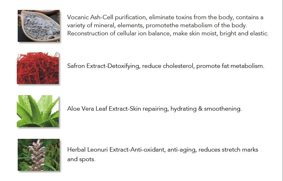 ANS:We use Volcanic Ash that can effective adsorption dirt and redundant oil on the skin, deep clean pores, make skin clean and fine and also it contain various of plant herbal powder, such as aloe vera, herba leonuri and saffron extract, it can improve blood circulation, promote the decomposition of melanin, have very strong spot beauty effect. In addition, it also has the effectiveness of weight loss, for y female friends, of course, still can rise to eliminate excess body fat, saffron reshaping the role of the female curve, let you have devil's body. So our body powder can except detox, also can fade away body spot, firming and loss weight.
