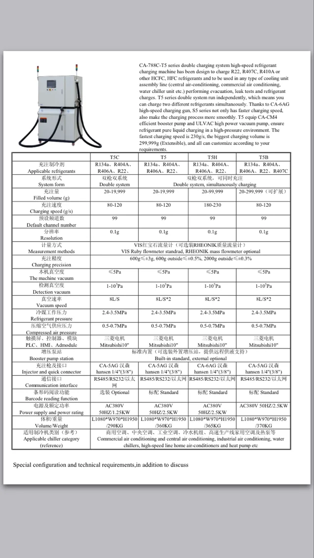 CA-788C-T5 series double charging system high-speed refrigerant charging machine has been design to charge R22, R407C, R410A or other HCFC, HFC refrigerants and to be used in any type of cooling unit assembly line (central air-conditioning, commercial air conditioning, water chiller unit etc.) performing evacuation, leak tests and refrigerant charges. T5 series double system run independently, which means you can charge two different refrigerants simultaneously. Thanks to CA-6AG high-speed charging gun, S5 series not only has faster charging speed, also make the charging process more smoothly. T5 equip CA-CM4 efficient booster pump and ULVAC high power vacuum pump, ensure refrigerant pure liquid charging in a high-pressure environment. The fastest charging speed is 230g/s, the biggest charging volume is 299,999g (Extensible), and all can customize according to your requirements.