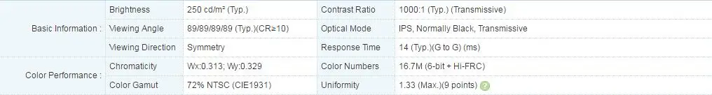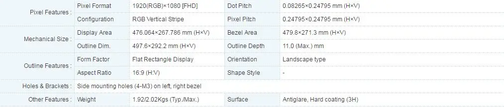 1.Specification of the 21.5 inch LCD panel