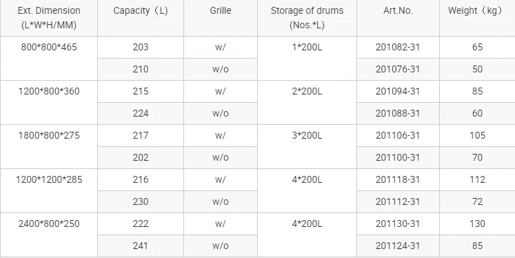 Space saving Sump net height 100mm, easy for hoisting and transportation For 60 /120 litre drums or small containers, in compliance with relevant regulations