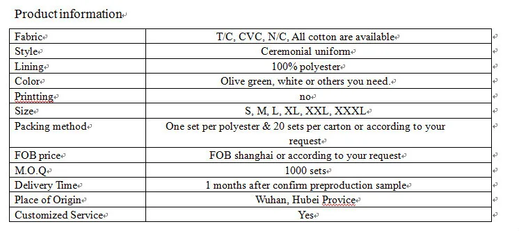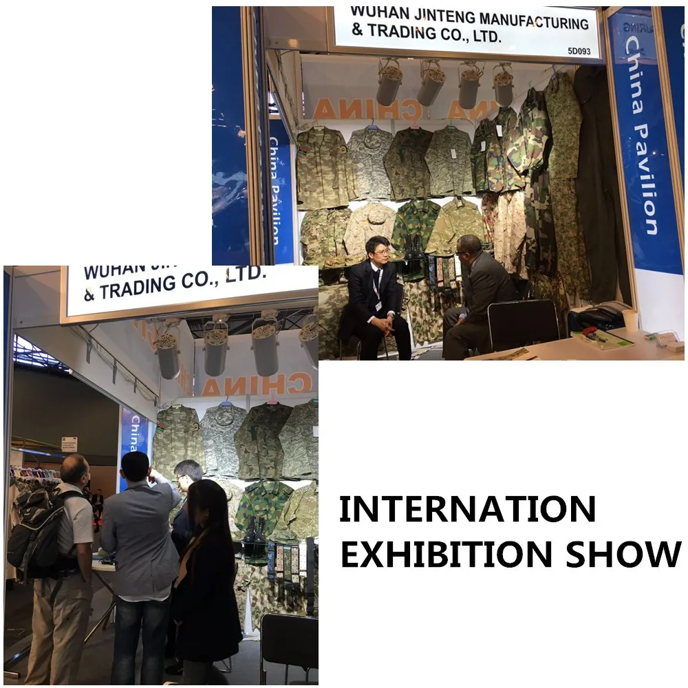 Since 2005, WUHAN JINTENG has succeeded in expending her products categories to diversification, making it far beyond the traditional textile and apparel industry and maintain her high quality to adapt to the international market diversified demand. Her major products are as follows: various military uniforms, field jacket, multiple pockets trousers, wool overcoats, tactical vest, raincoats, sweaters, shirt and overall. Because of her superior quality and excellent workmanship,JINTENG is praised by the customers from Europe,American,Middle East Area, Africa and Latin America countries.