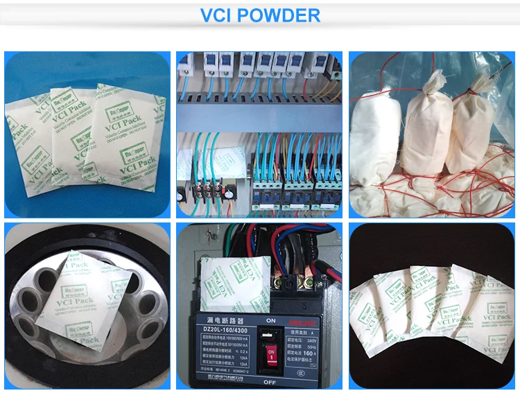 china hign effeciency rust inhibiting powder sachet, a kind of water soluble antirust powder that may be used in both dry process and wet process. It is mainly applied to corrosion-inhibiting treatment for internal surfaces of depression, hollow or cavity of metal articles. Fantastic antirust effect can be obtained by applying dry VCI powder in a confined space. With gasification, VCI adheres to metal surfaces to form a compact protection film which plays a role of antirust. In the manufacture industry of pressure vessel such as boiler, VCI powder mixed with water is often used for hydrostatic test.