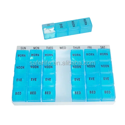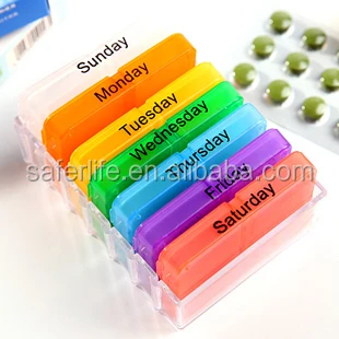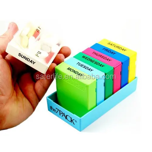 This product contains seven lath like pill boxes, which makes the entire item look like a tall building. The lowest box should be extracted before the user takes the pills out of it, and it should be put back in from the top.