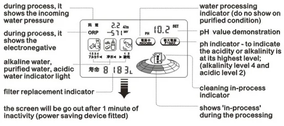 Displays pH, ORP, water flow rate, working status, Alkaline, Pure, Acidity, cleansing and filter service life