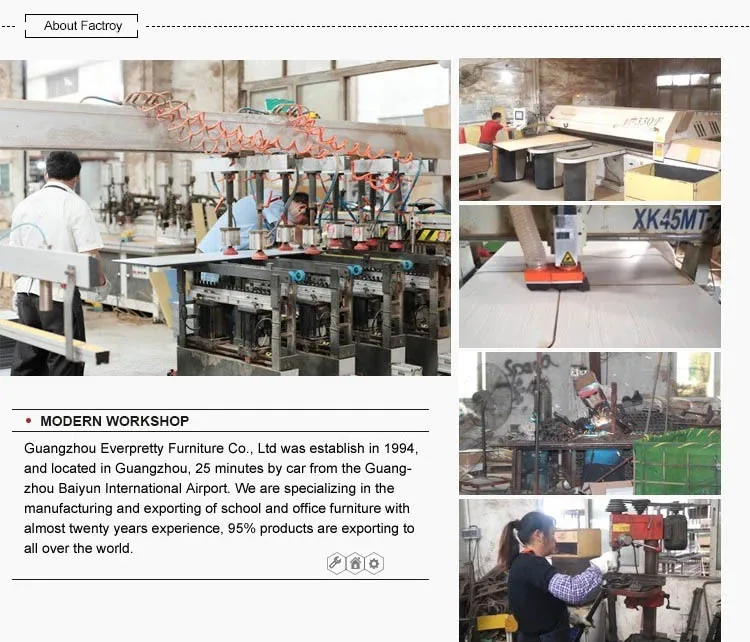 Guangzhou Everpretty Furniture Co., Ltd. was established in 1994. We are specializing in the manufacturing and exporting of school and office furniture with almost twenty years experience. Is a collection of research and development, design, production, sales, service as one enterprises. Our company covers over 20,000 square meters, has a modern office building, hardware, well - equipped workshop, advanced management mechanism. We accept orders against customer's samples, specified designs, specifications and packaging requirements .Each production procedure of the workshop is in strict compliance with the ISO 9000 system.