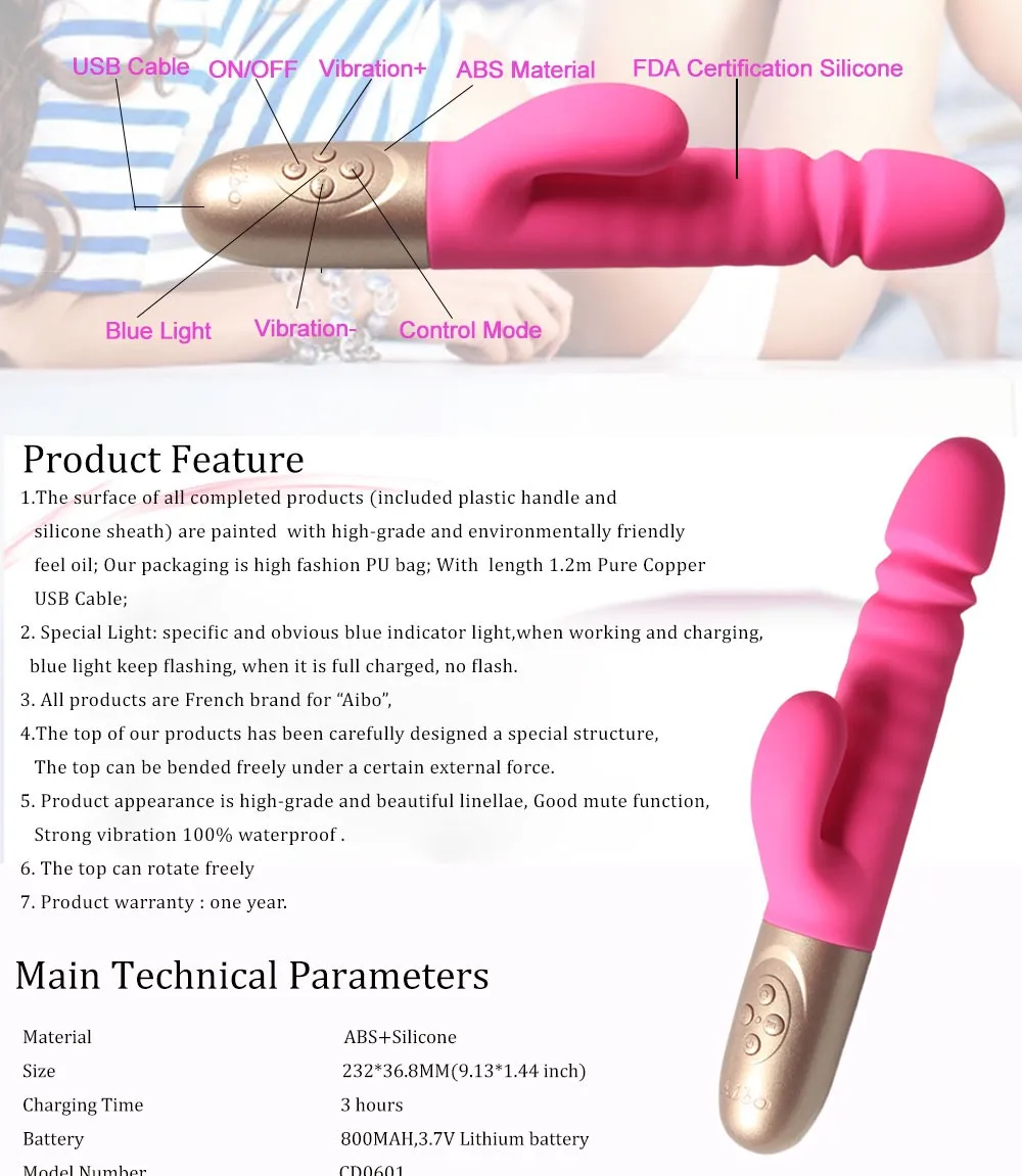 6Features: | 1. 3 vibration motors/Triple motors. 2. 4 key buttons 3. USB Charge(1.2m+full copper) 4. 7 different vibration modes+the top can extend up and down 5. Specific and obvious Red/Blue indicator light to make you feel more comfortable 7. 1 Year warranty |