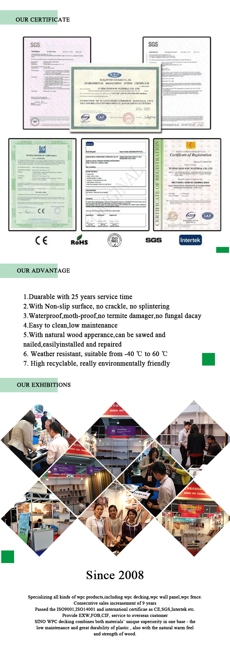 Jiangsu Sino Technology Co.Ltd is the professional manufacturer of wood plastic composite wpc decking ,it was founded in 2008 and located Yixing,Jiangsu ,China. During the past 8 years, Sino is always the leader in the field of WPC decking, and only produce the high quality wpc decking.