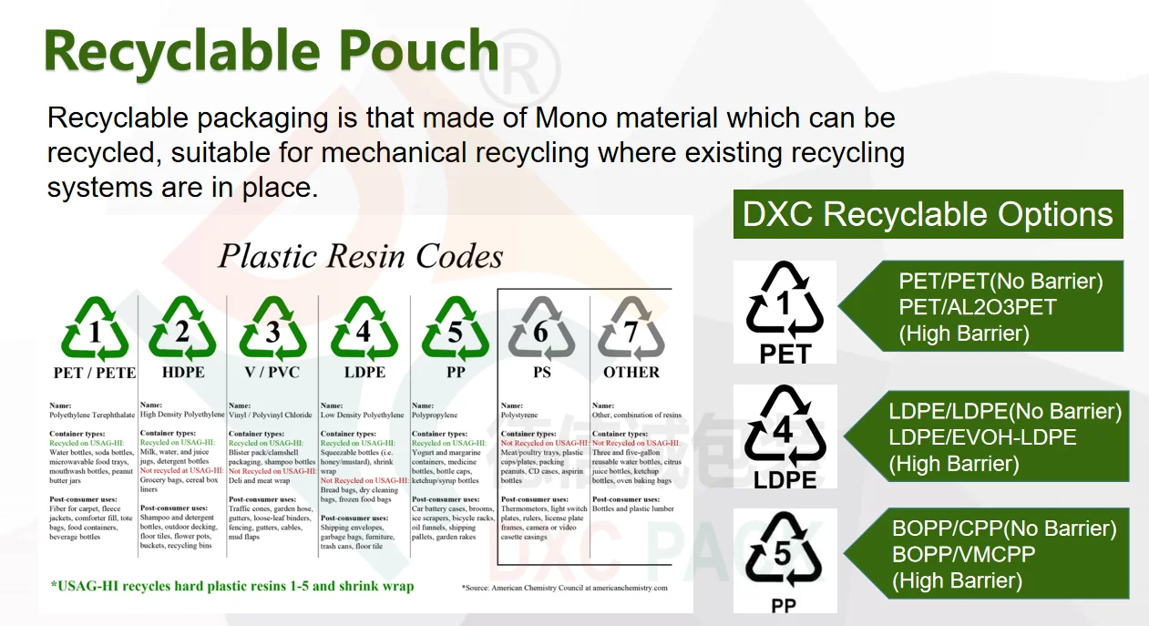 DXC recyclable barrier bag just only PE material and used EVOH coating on it for barrier function. EVOH is imported from Amcor, its OTR and WVTR both within 2.0, so it's very closed to Aluminum but eco-friendly. | ||
