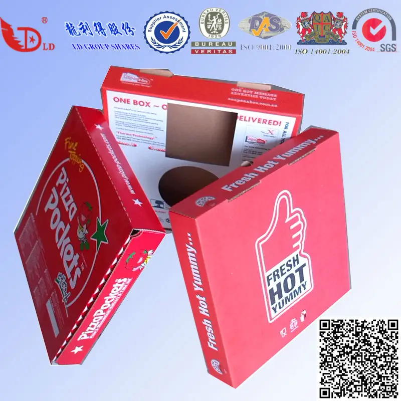 | 4 | Opportunity to communicate and promote your product and brand messages | Cut away holes at the front for easy opening,Ventilation holes on cheap carton pizza box to remove moisture |
