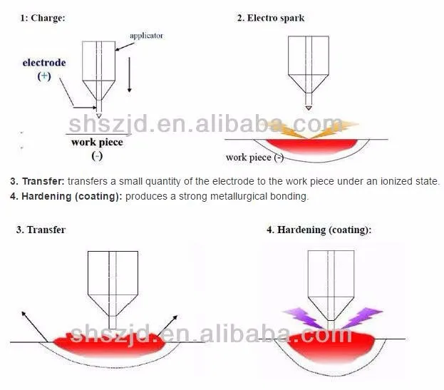 Cold welding machine is using arc spark effect in the air. Electrode material made of alloys is sparking dissolved and deposited on the metal work piece.