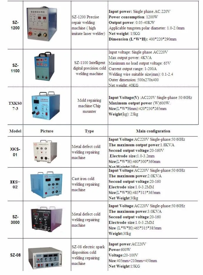 01. Casting iron parts, nonferrous metal parts welding/ repairing, choose ESD (electrical spark deposition) cold welding machine; (our machine model XKS-01, XKS-02, SZ-3000, SZ-08).