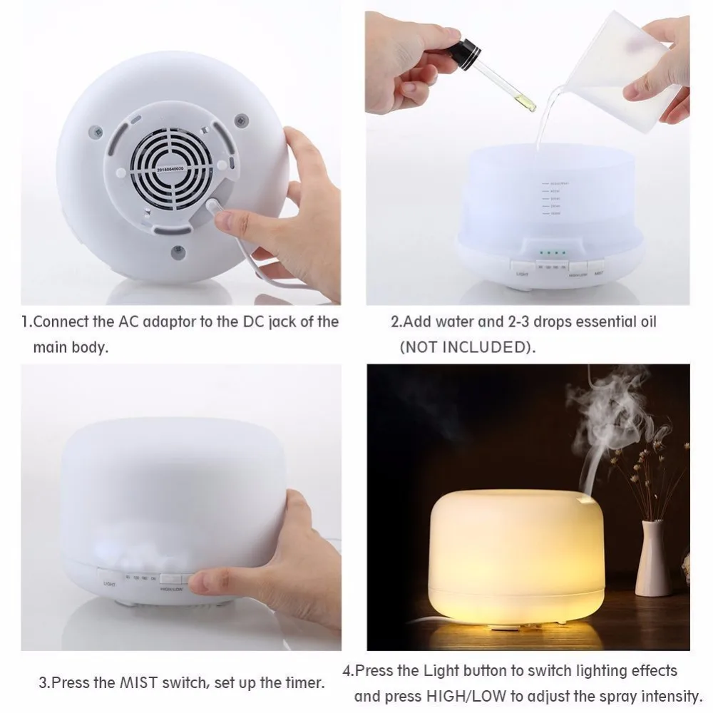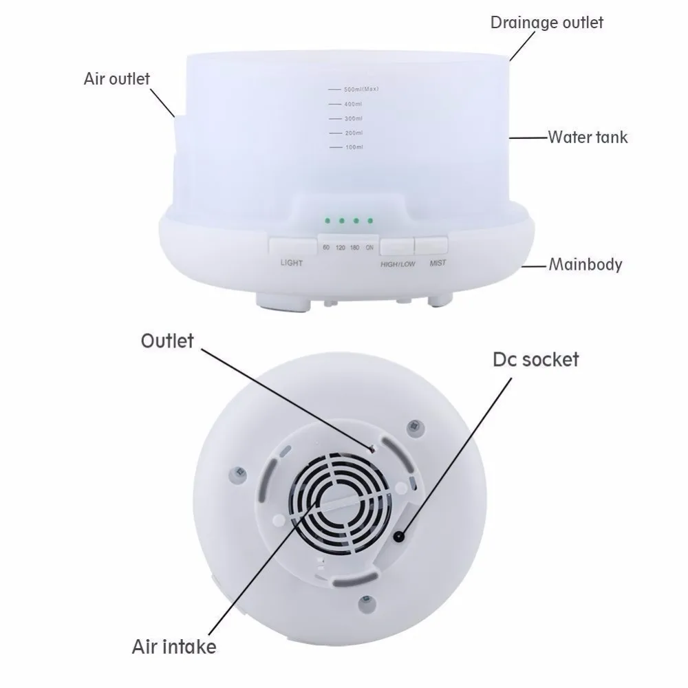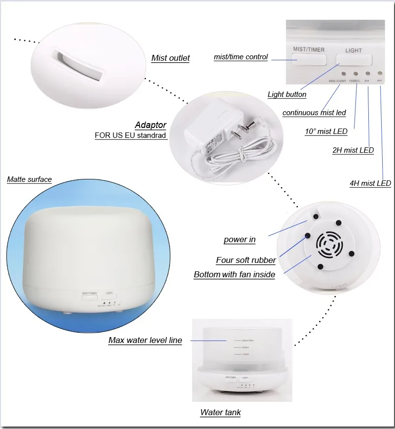 ★Large 500ml water capacity that can continue use up to 10 hours each time. When time is up or there is no water, it will turn off automatically. Press the "Mist" button, choose the timer from 60 mins, 120 mins, 180 mins or ON.