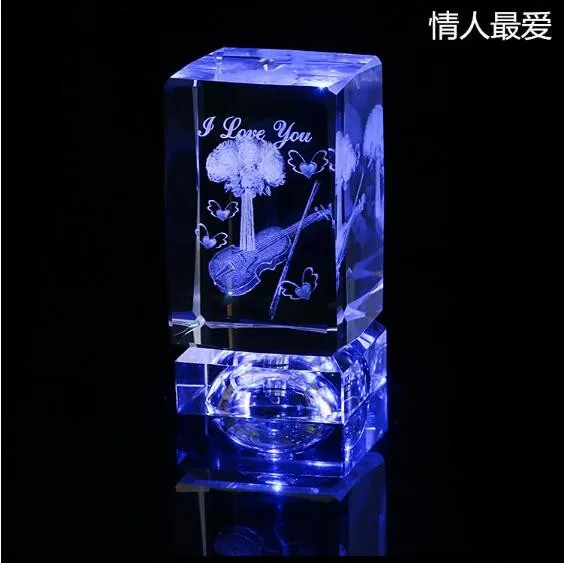 3D Laser Engraved Crystal Glass Rose Flower Cube With Led Light Base For Birthday Gifts