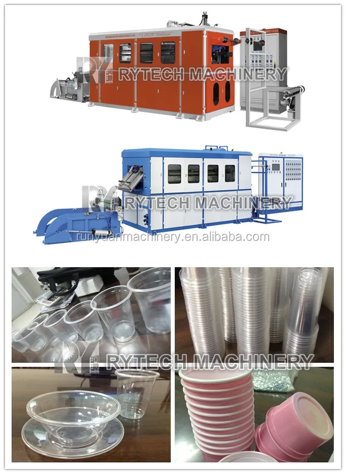RY-YB 720 Series Full-automatic Hydraulic Cup Making Machine developed by our company is a fully automatic plastic container forming machine which features in high speed and high efficiency. Applicable materials include PS, PP, PE, PET, PVC and ABS.
