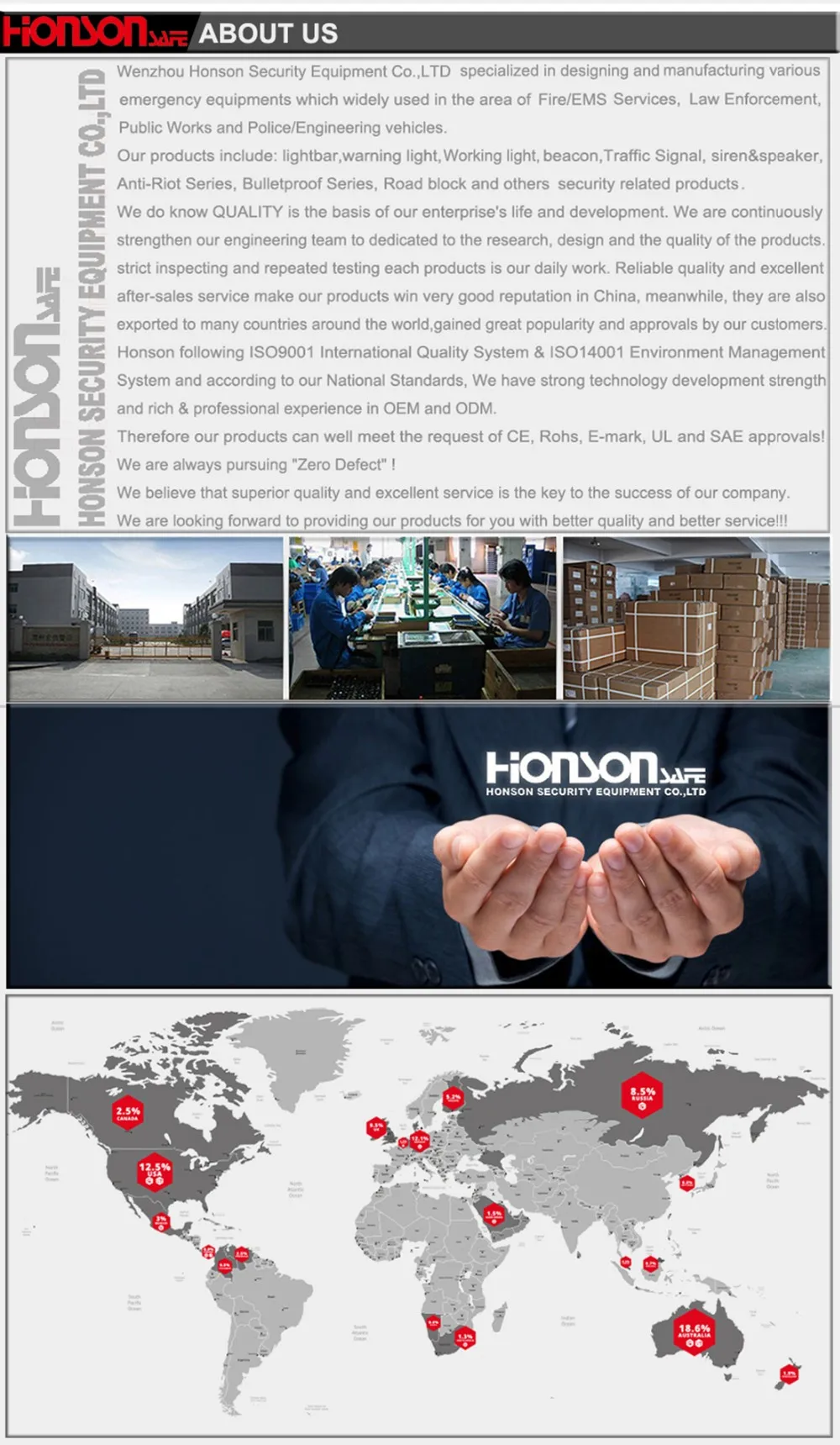 Wenzhou Honson Security Equipment Co.,LTD Since 1999, specialized in designing and manufacturing various emergency equipments which widely used in the area of Fire/EMS Services, Law Enforcement, Public Works and Police/Engineering vehicles.