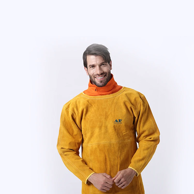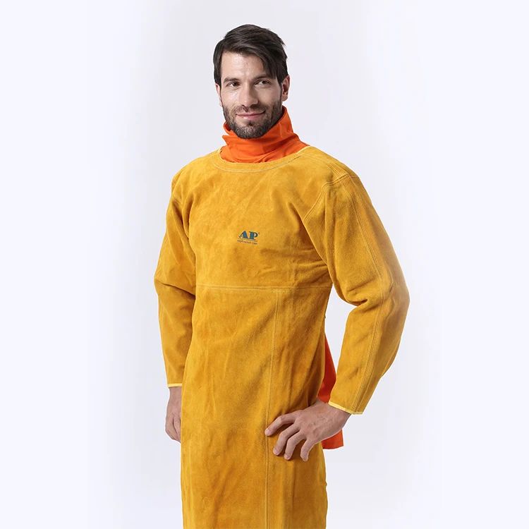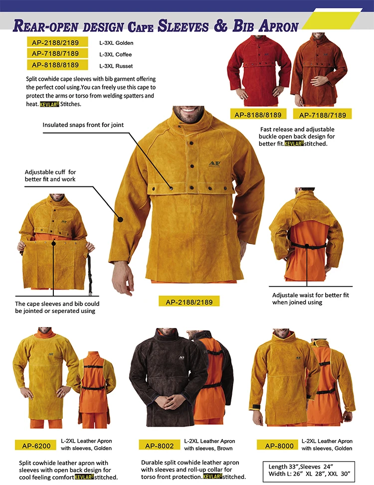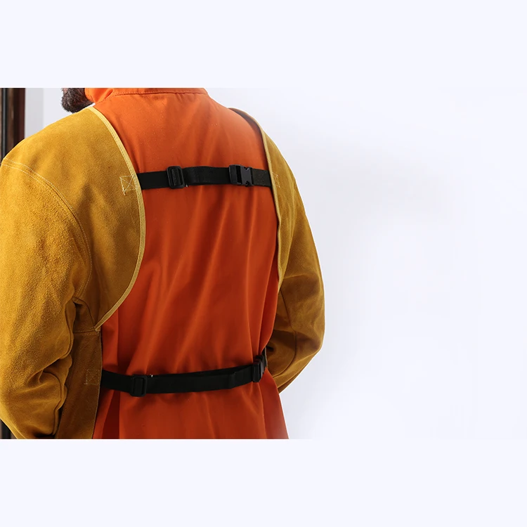Feature | Leather Welding Apron with Sleeves * This apron is made from the durable and pliable, abrasion and heat resisitant selected split cowhide leather; * Continuous welted seams with 3 ply KEVLAR® stitched for added durability and falme retardant; * 2.5cm Wide Cotton Sliding length self balancing adjuster; Quick-release buckle;Ajustable slider and divider. * Suitable for applications invoving both material handling and welding. |