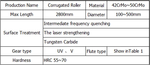 | I. Intermediate Frequency Corrugated Roll 1. Tooth shape: UV, V, alike V type 2.Tooth height: 0.9-5.5mm 3. Process length: Max. roller length 2800mm 4. Process diameter: Φ 100mm~Φ 500mm 5. Material: made in China, 42CrMo~50CrMo 6. Hardness: ≥ HRC55° | ![]() |