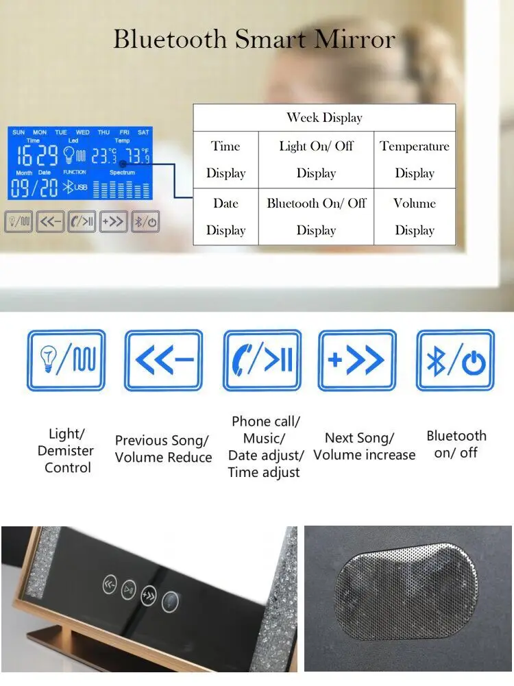 Function for choosing | Touch Switch/ Three colors lighting/ TV/ Clock/ Night Light/ Magnifier/ Demister/ IR Sensor Switch |