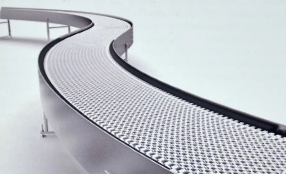 improved efficiency and system reliability, combined with gentle, efficient handling of various package types and the ongoing flexibility to manage future packaging innovations. This smart, automated conveyance system and slat chain provides layout optimization and industry-specific solutions that cannot be obtained with alternative technology.