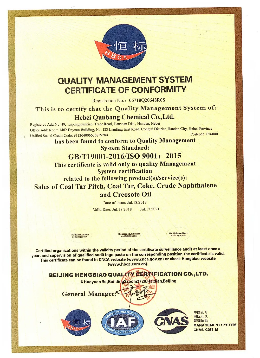 Hebei Qunbang Chemical Co., Ltd. was founded in 2007 , It is the one chemical company that produce coal coking products and refractory material in Hebei province. It has their own independent chemical factory, specializing in the producing high temperature coal tar pitch, low-temperature coal tar pitch, globular coal tar pitch, creosote oil, industrial crude naphthalene, coal tar, refractory material, carburant, activated carbon, etc. The company has independent import and export right, and its products are exported to India, Brazil, Southeast Asia, Africa, South America and so on. The annual exports of chemical products is 50000 metric tons and annual export sum of coal tar pitch and industrial naphthalene in 2013 ranks the first in Hebei province. The company covers an area of 3.35 hectares, with its own large laboratory, transportation team, and logistics network.