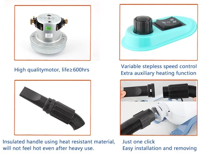 * Brand new "Cyclone" with improved system for may sides: more powerful, low noise, well-distuibuted wind speed, longer service life, safeguard simply, easy operation to adjust speed & blowing rate absolution free.