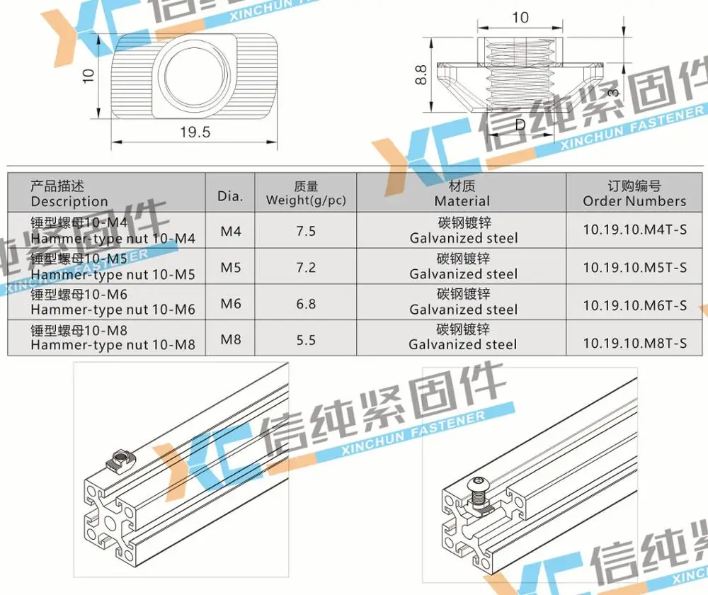 T-nut also known as hammer-type nuts, put it into the slot directly from outside of profile when assembling , clockwise 90 degrees it can be automatically locked, extremely easy to install and it is also one of the most commonly used accessories for aluminum system.