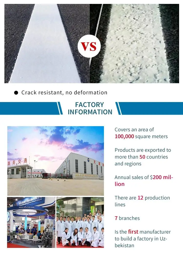 1) Higher adhesive strength: Special elastomer is added in our recipe of thermoplastic road marking paint in order to improve the adhesive strength
