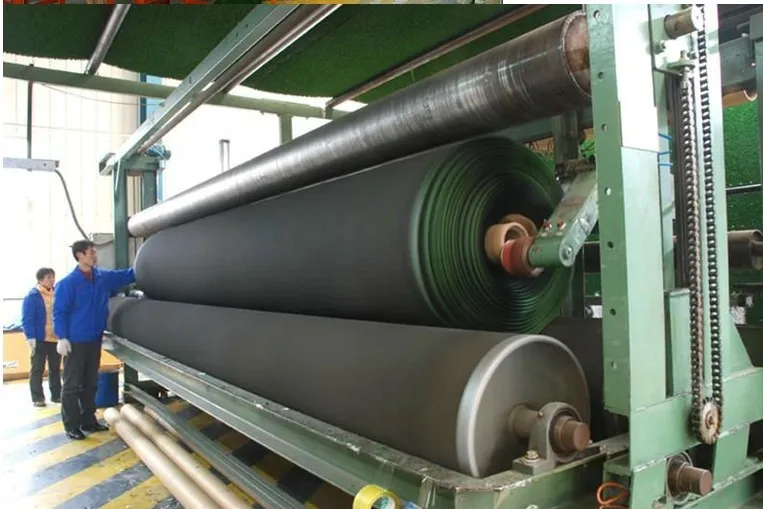 Infill rubber granules:After sand infilling, Place the rubber granules piles on the lawn on different spots evenly at a distance of 4m from each other, then spread them evenly on the lawn(the quantity of sand depends on the pile height of the turf). Afterwards, use the combing machine to sweep the sand into the fibers and to comb up the fibers. Do this process once longitudinally and transversely.