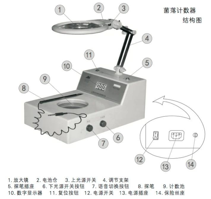 ALN-50S type speech colony counter is a digital display semi-automatic bacterial testing equipment. The counting chamber, exploration pen, counters and digital displays and other components. Counter using CMOS integrated circuit technology design, fast and reliable counting, the number of voice messages clear; digital display with LED digital tube display intuitively; special probe pen, sensitive and accurate; depth shading on background counting pool, glare-free lighting backlight up and down the side of the exit, make colonies contrast clear; flexible adjustable bracket, you can adjust the focal length of the magnifying glass and the illumination distance, more humanized, to avoid missing a small colony counts, resulting in inaccurate test results.