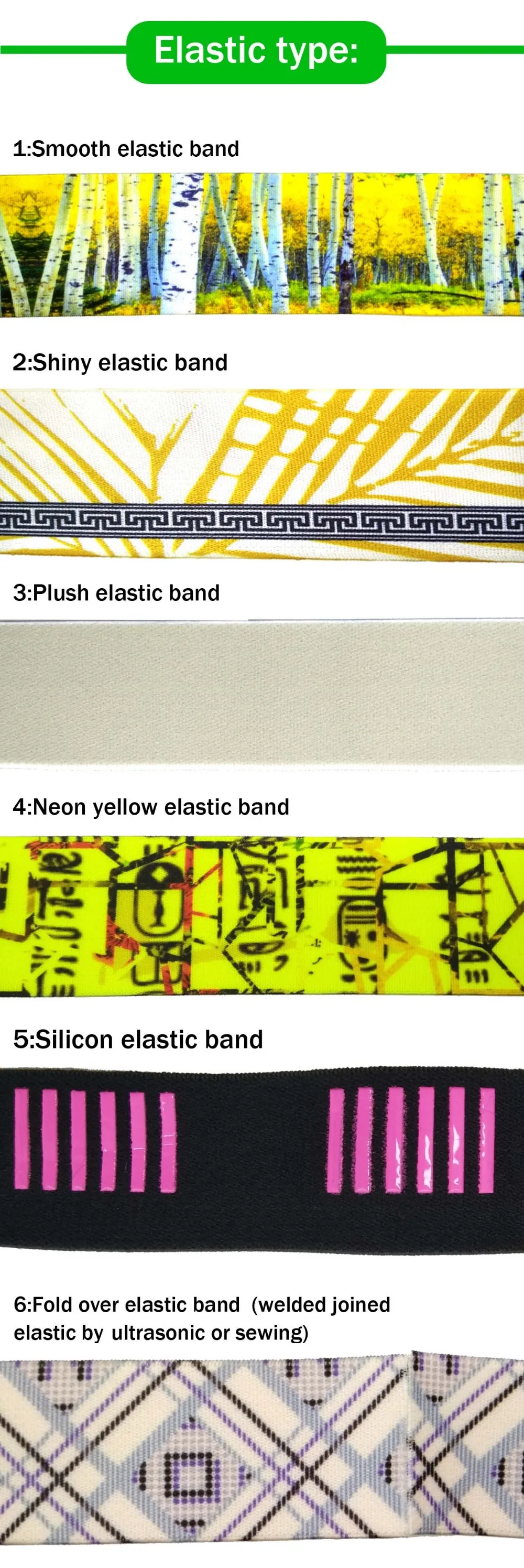 Fabric Type: | Normal elastic ,shiny elastic ,plush elastic, 3D elastic etc |
