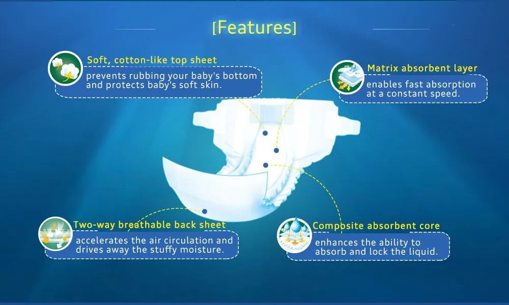 Material | Soft nonwoven fabric top sheet Double absorption core, high absorption Imported Super Absorbent Polymer, Wood pulp Water proof PE back sheet PP frontal tape with refastenable adhesive tape 3D leak prevention channel |