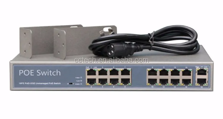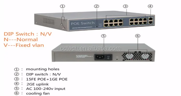 It provides 15 10/100mbps POE and 1 10/100/1000mbps POE auto-sensing rj45 port,output 24v passive POE.Each poe port output max 30w,total poe power 300w built-in,AC 100-240V.