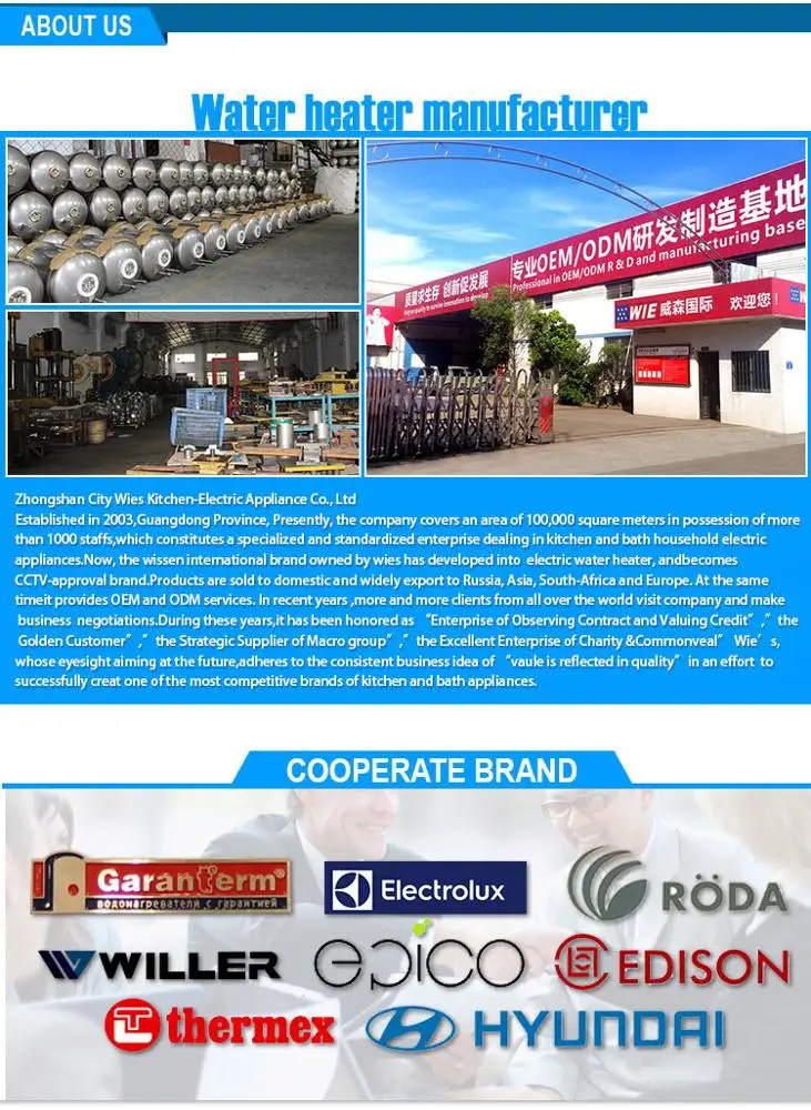 Wies Strictly control the product quality, and have Independent of storage electric water heater.which have make us get more from the customer's trust .and cooperation.Our prodcuts are sold to demostic and widely exports to Russia,Asia,South-Africa and Europe.